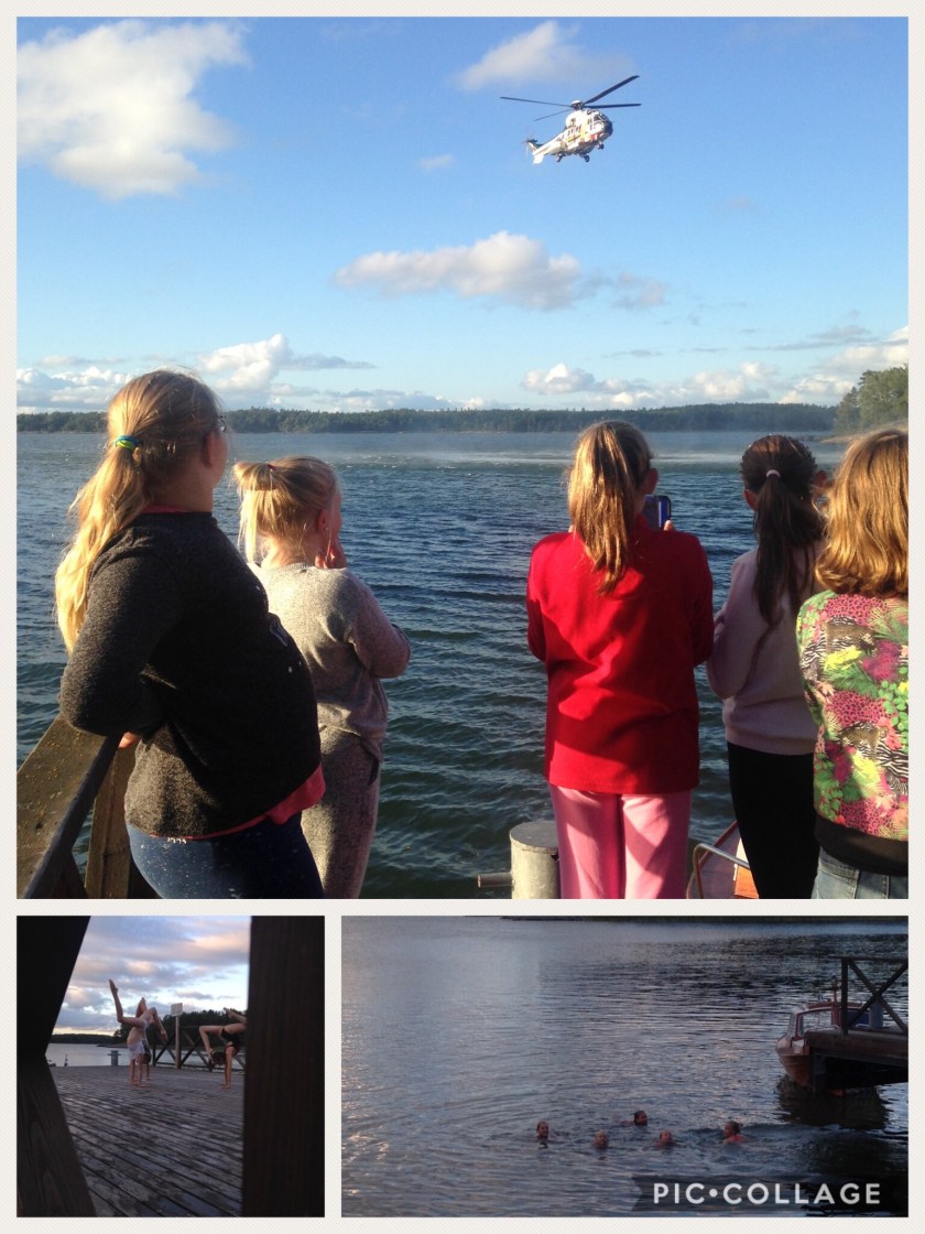Efter middagen var det dags för bastu men innan bastun fick vi ett mycket uppskattat överraskningsbesök. Vi fick se hur man räddar en människa från vattnet till helikoptern.