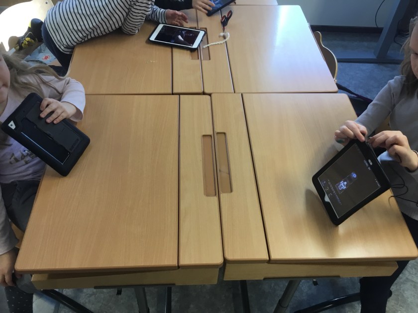 Vid den tredje stationen arbetade vi vid våra lärplattor med programmeringsappar. Vi laddade ner en ny app som heter A.L.E.X. I den appen ska man programmera en robot att gå till en portal. Men man ska akta sig för att göra fel, då faller han ner från banan! Det blev väldigt klurigt då det också kom plattor som rörde sig när man steg på dem.