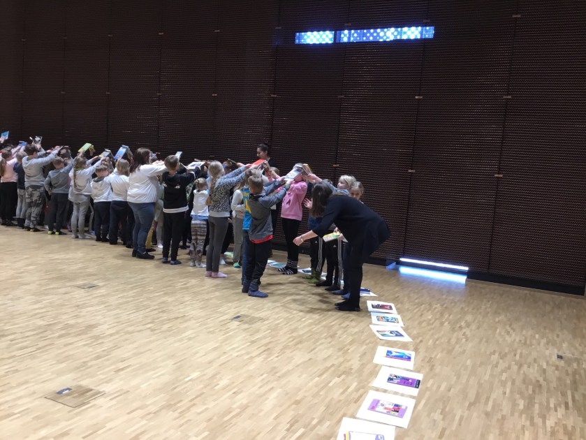 Vid den fjärde stationen var det vi själva som var robotar, hubots! Human robots. Vår första uppgift var att ta oss från start till mål utan att stiga på någon bild. Som hjälp hade vi kodkort. De lade vi ut så att kompisen kunde se hur man skulle gå. Vi fick också göra egna banor och lärde oss ge instruktioner. En instruktion var att du ska ta dig från start till mål men du måste gå via Pikachu!