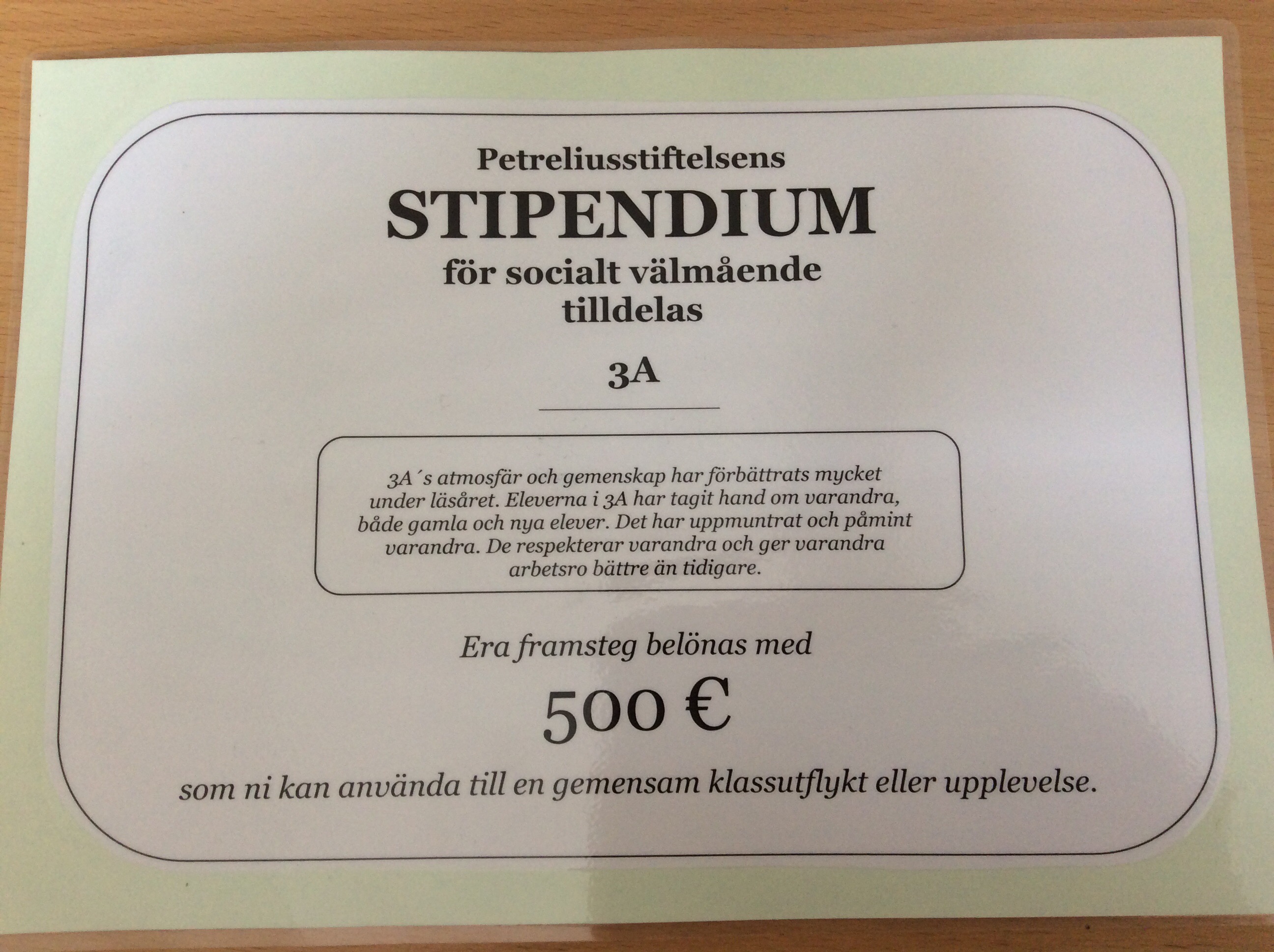 Rektorn har nu tillsammans med social- och hälsovårdsministeriet valt att tilldela Petreliusstiftelsens stipendium för socialt välmående åt klass 3A. 3A blev tilldelad stipendiet med motiveringen: