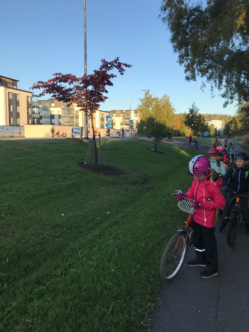 Det blev en tidig start från skolan. Hurtigt trampade vi iväg trots det kyliga vädret. I en lång fin kö for vi mot för eleverna okänd ort.