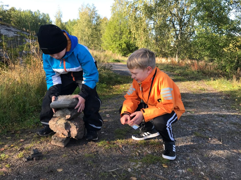 Då vi kom fram och parkerat cyklarna vandrande vi in i skogen. Vi letade löv, pinnar och svampar. Funderade på vad de hette och ritade sedan av dem och räknade vad vi hittat.