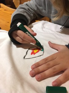 Vi gjorde läger t-skjortor. På t-skjortorna ritade vi en logo som vår klasskompis Stella Sell hade designat. Logon föreställde ett berg, ett träd och en lägereld. Logon såg ut som en svår uppgift att rita, men den var egentligen rolig att rita och inte så svår. Sedan fick man rita och skriva vad man ville på t-skjortorna. När alla var färdiga satt man på sig skjortorna och alla hade på dem resten av lägerskolan.