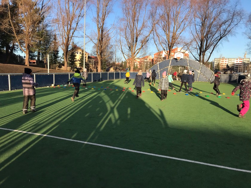 Gymnastiken var fartfylld och skojig. Vi började med att leka kinamuren, sen spelade vi lite korgboll som var nytt för många. Vi avslutade med bläckfisken. Solen sken och alla fick springa och röra på sig.
