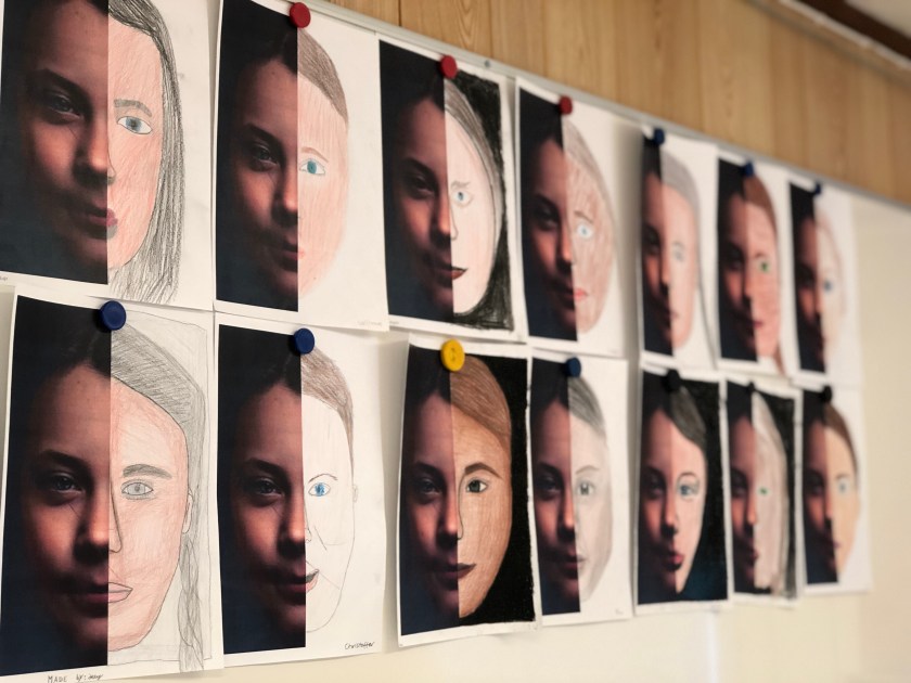 Följande dag fick eleverna var sitt papper med halva Gretas ansikte. Deras uppgift var att rita andra halvan. Därigenom övade vi symmetri. Eleverna fick också fylla i en Padlet kring klimatsmarta val i vardagen.