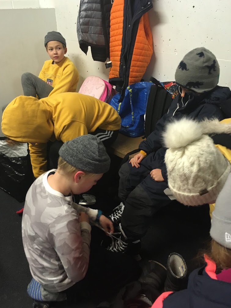 Eleverna i åk 5 hjälpte sina vänelever att knyta skridskorna.