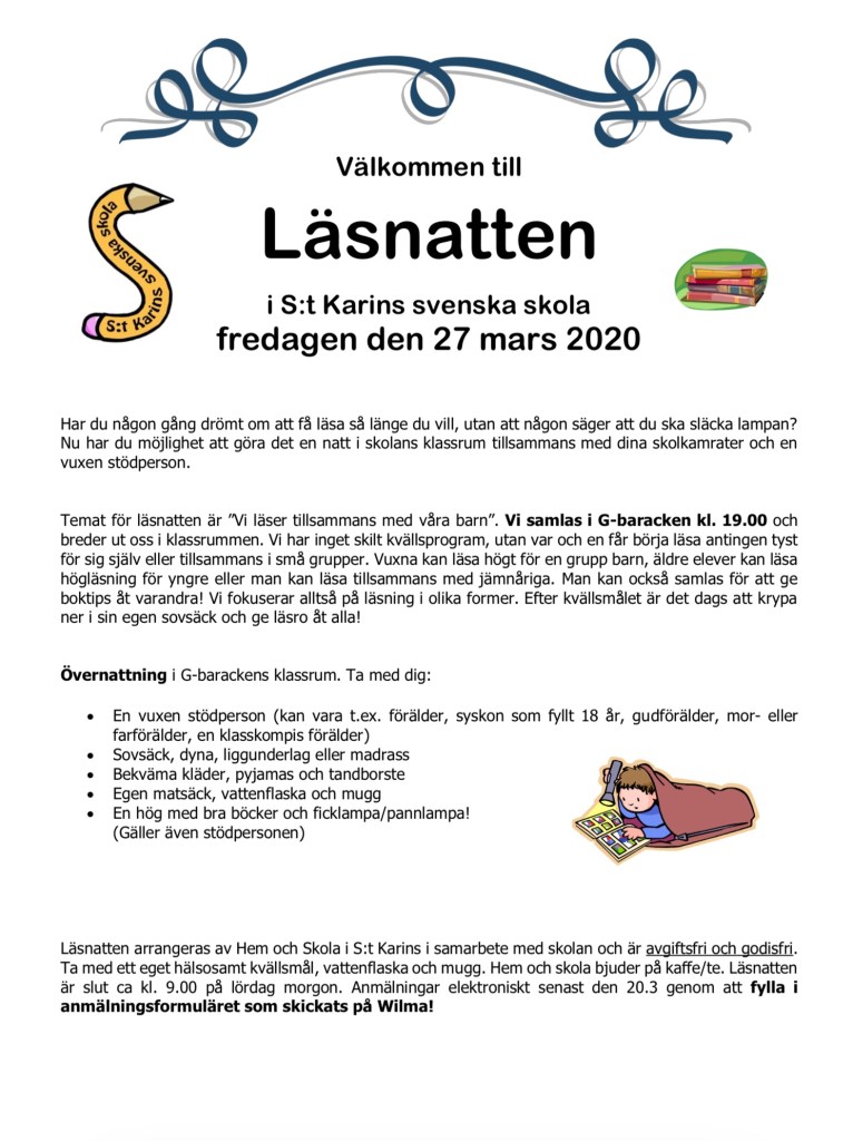 Läsnatten ordnas i samarbete med Hem och skola i S:t Karins den 27-28.3. Alla läsglada elever och föräldrar är hjärtligt välkomna, anmälningar via Wilma.