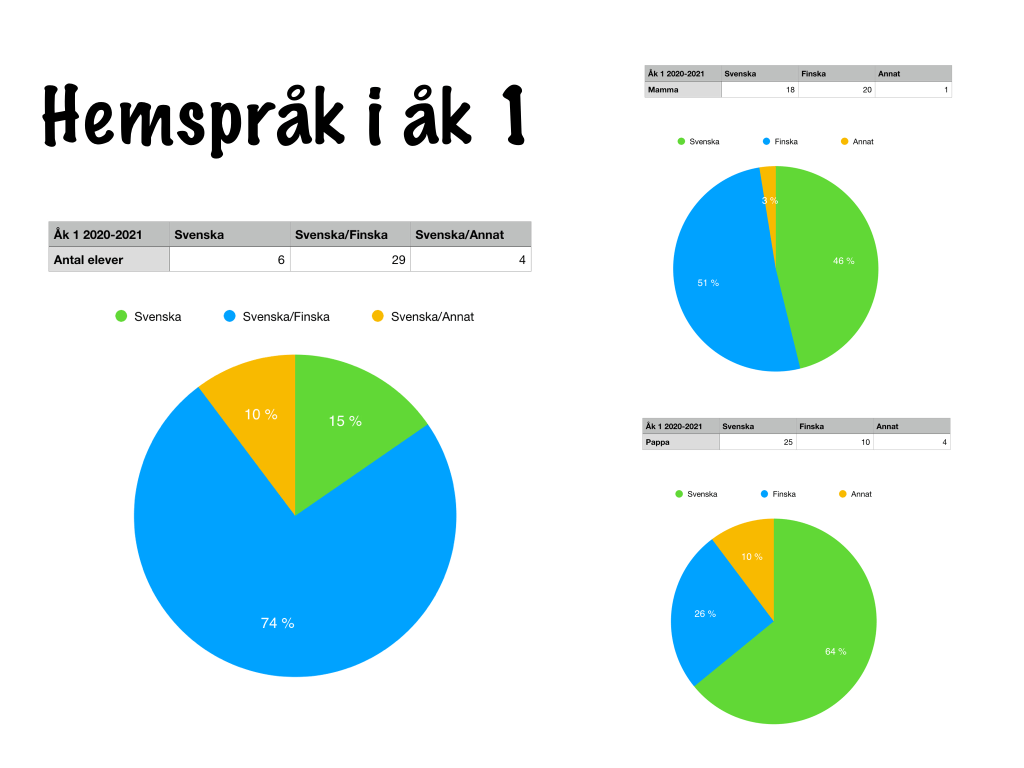 Som rektor lyfter jag alltid fram hur viktigt det är att stöda det svenska skolspråket också hemma, då vi är i en så finsk miljö i S:t Karins. Jag brukar kolla upp de blivande ettornas hemspråk och göra lite statistik på språken. I år ser det ut såhär (en väldigt normal situation, ca 15% av eleverna i hela skolan kommer från enspråkigt svenska hem).