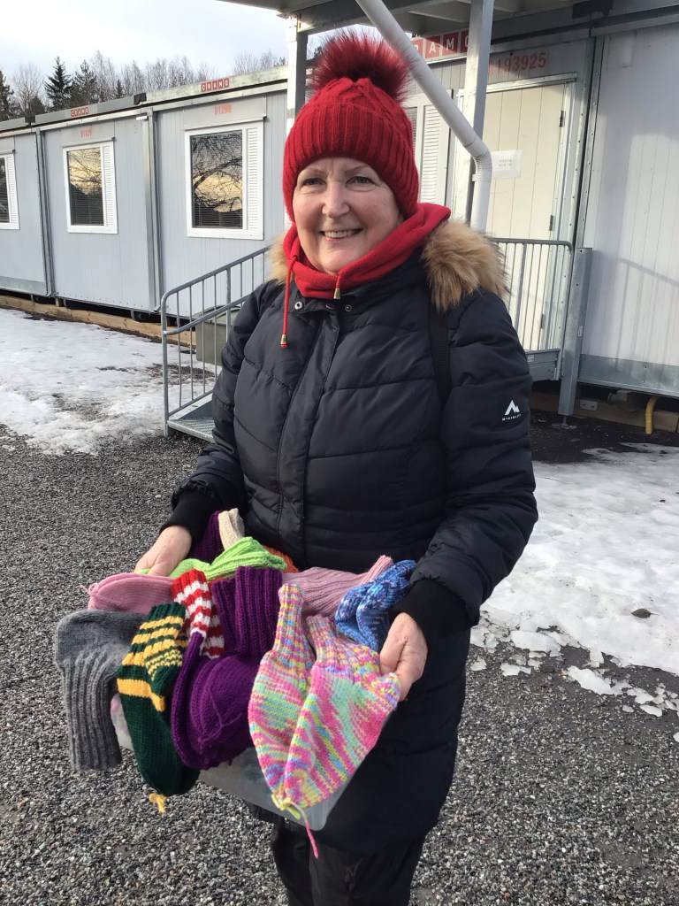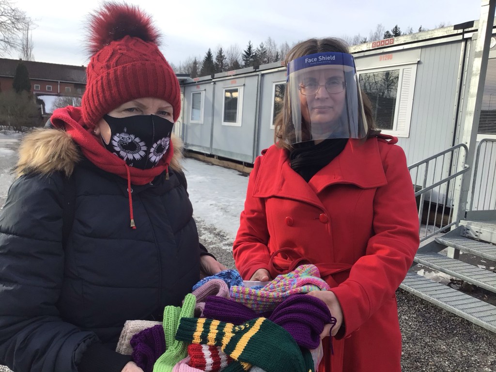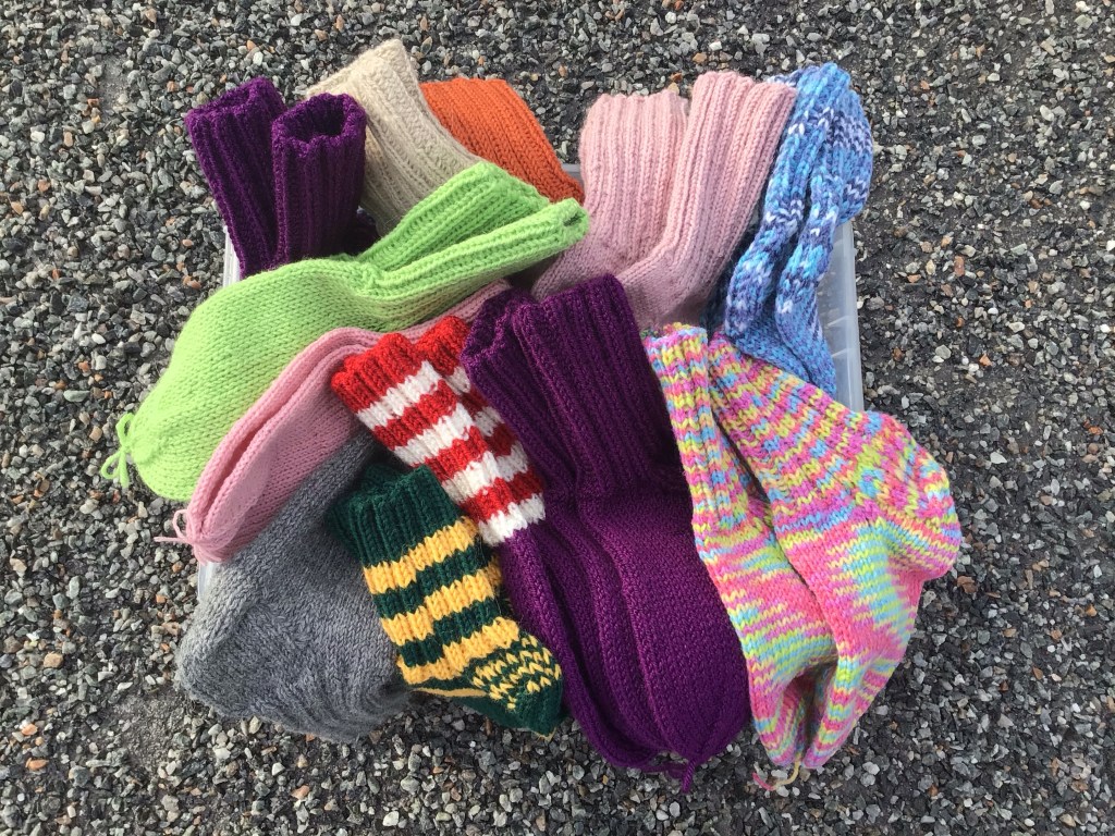 Idag har skolan fått ta emot en donation med yllesockor från Röda korsets grupp Ahkeraliisat i S:t Karins. Pepita Suvanto hade hört om att de gamla barackerna har kalla och dragiga golv och hon kontaktade skolans rektor för att höra om det skulle finnas behov för lite yllesockor som eleverna kan låna vid behov.