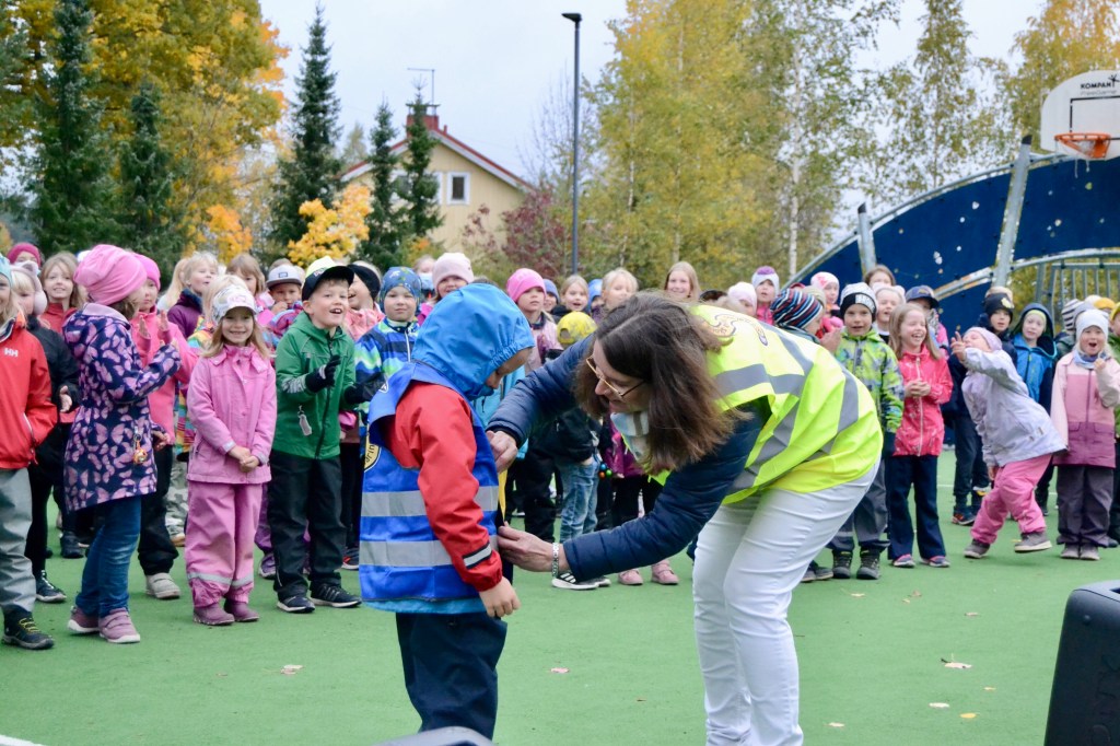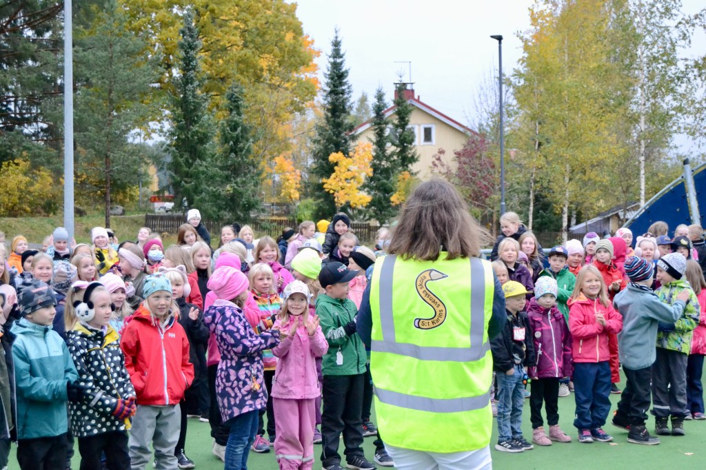 Så kom rektorn med lite överraskningar 🥳 Alla vuxna får en ny reflexväst med skolans logo på ryggen. På det sättet vet alla elever vilka vuxna som talar svenska på skolgården.