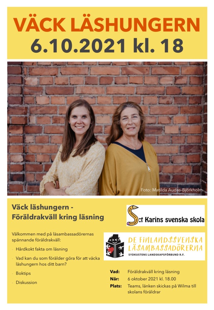 Omsdagen den 6.10 bjuder vi på en inspirationsföreläsning om läsning och hur man kan väcka barnens läshunger. Läsambassadörerna Henrika Andersson och Amanda Audas-Kass ger goda råd och tips på bra böcker, kom med! Länken har skickats på Wilma.