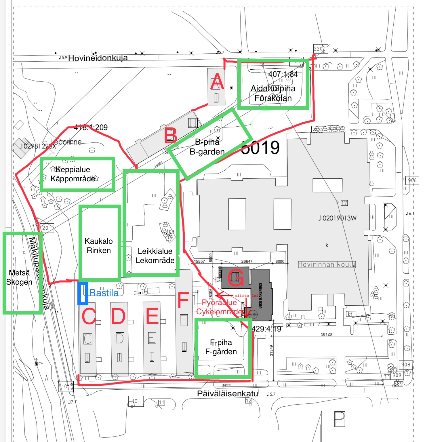 Augusti inleds i samma barackutrymmen i C, D, E och F-barackerna som vi hade på våren. På skolgården pågår rivning av det gamla skolhuset och arbeten med grunden till den nya G-baracken som ska vara klar i januari. Vi uppmanar alla att vara extra försiktiga i närheten av skolan och påminner om att Päiväläisenkatu inte ska användas av föräldrar i privatbilar på morgonen. Lekområden för eleverna är utmärkta med gröna rutor på kartan. Vi har gått igenom skolgårdens gränser, trygghet och säkerhet med alla elever den första skoldagen.