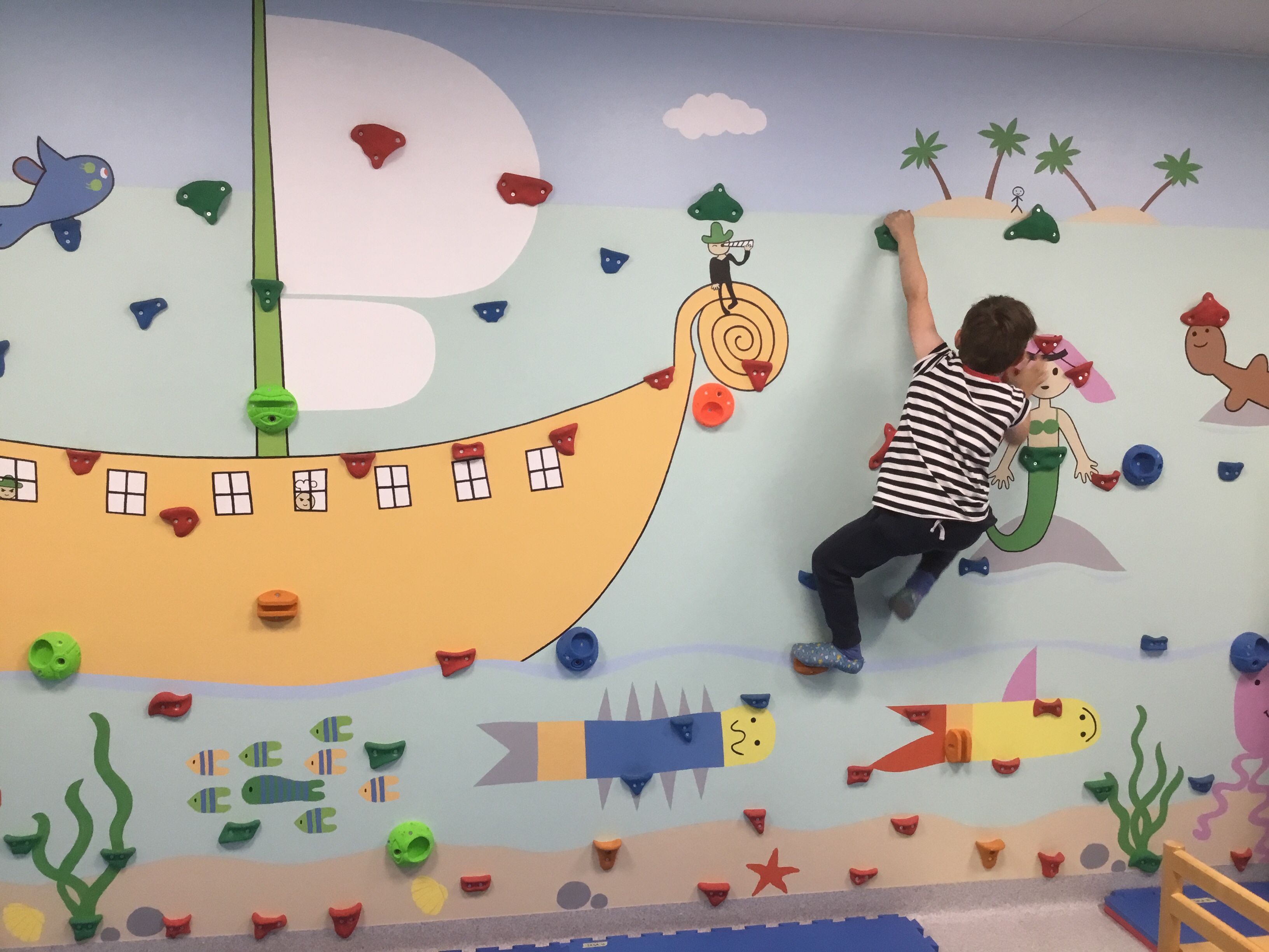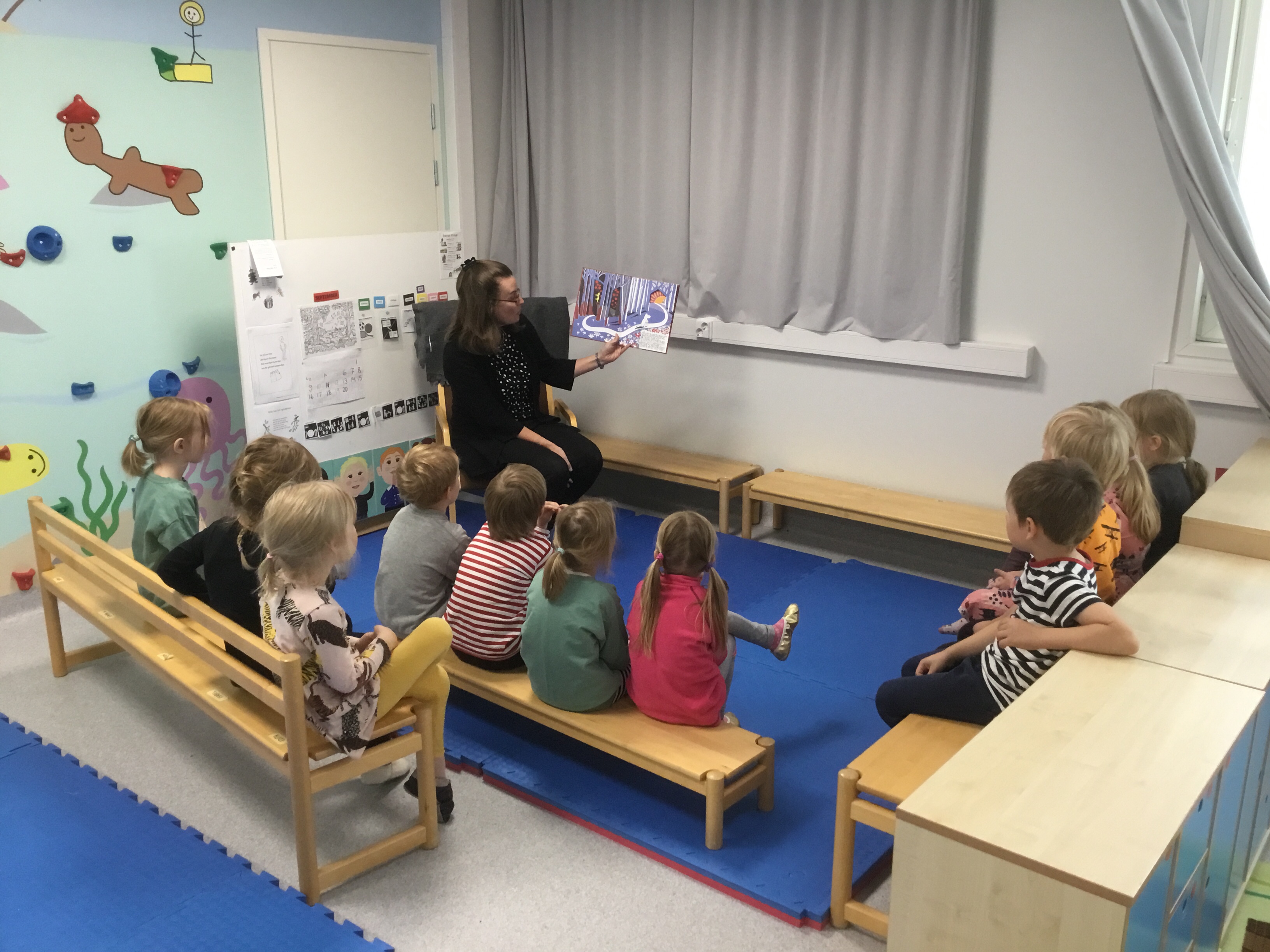 Svanarna har sina utrymmen i daghemmets gymnastiksal/allaktivitetsrum och där finns en rolig klättervägg! Efter högläsningen klättrade barnen längs väggen till handtvätt och lunch 👍