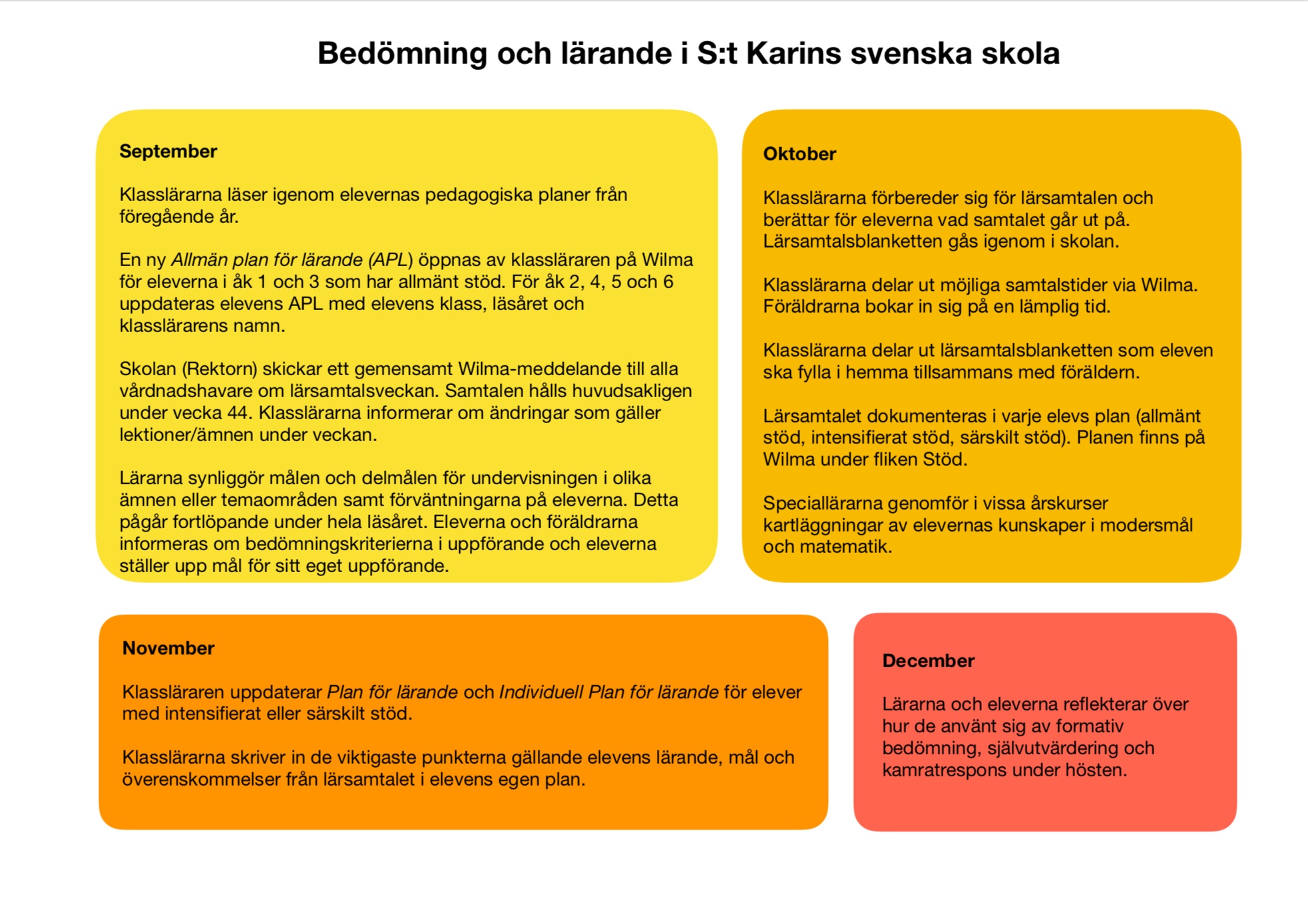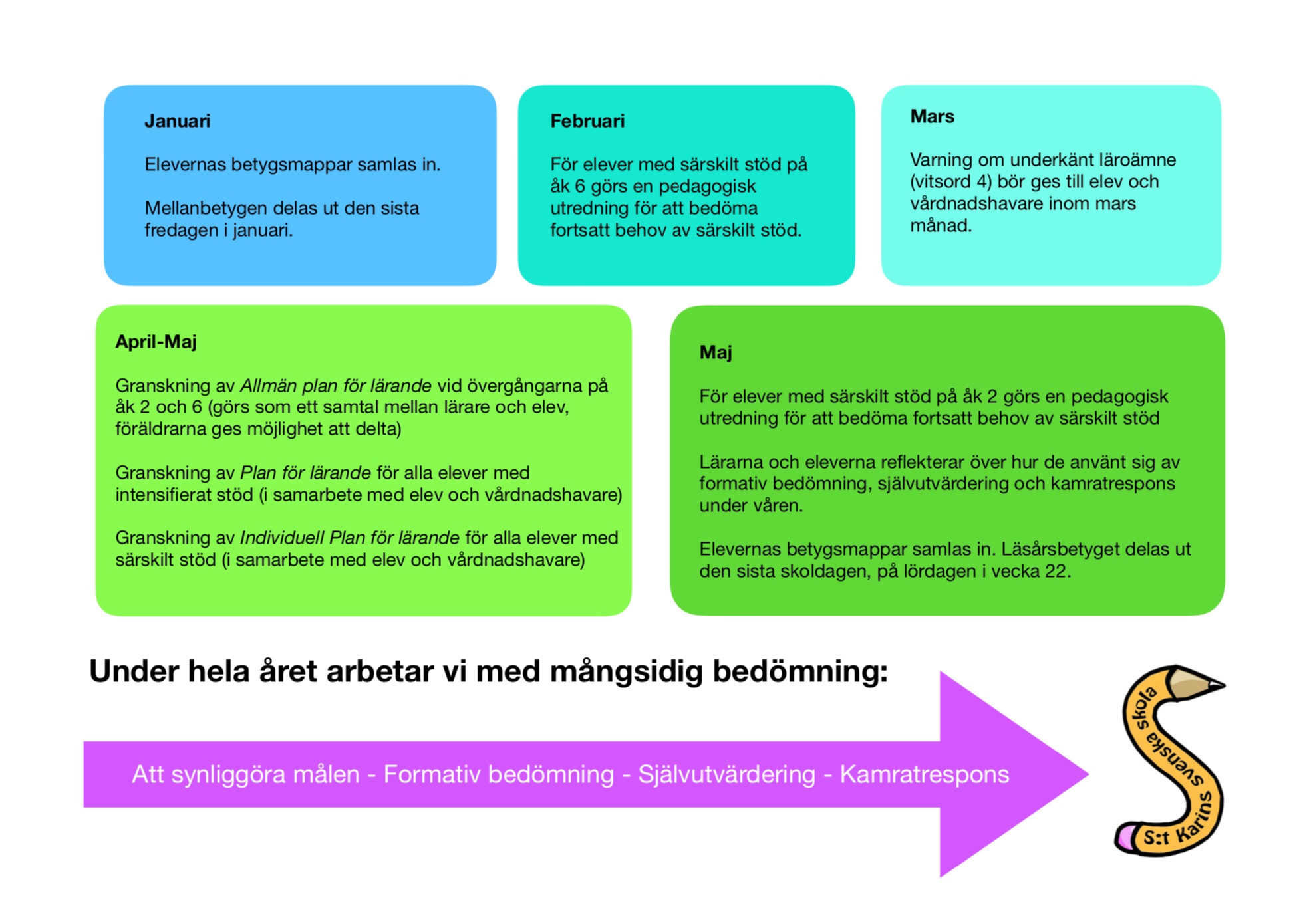 Enligt läroplanen ska vi synliggöra bedömningen och lärandet för eleverna och föräldrarna. Det här är ju inte alltid så enkelt, men nog så viktigt! Vi har gjort en årsklocka för bedömning och lärande som vi hoppas att kan vara till hjälp 😊