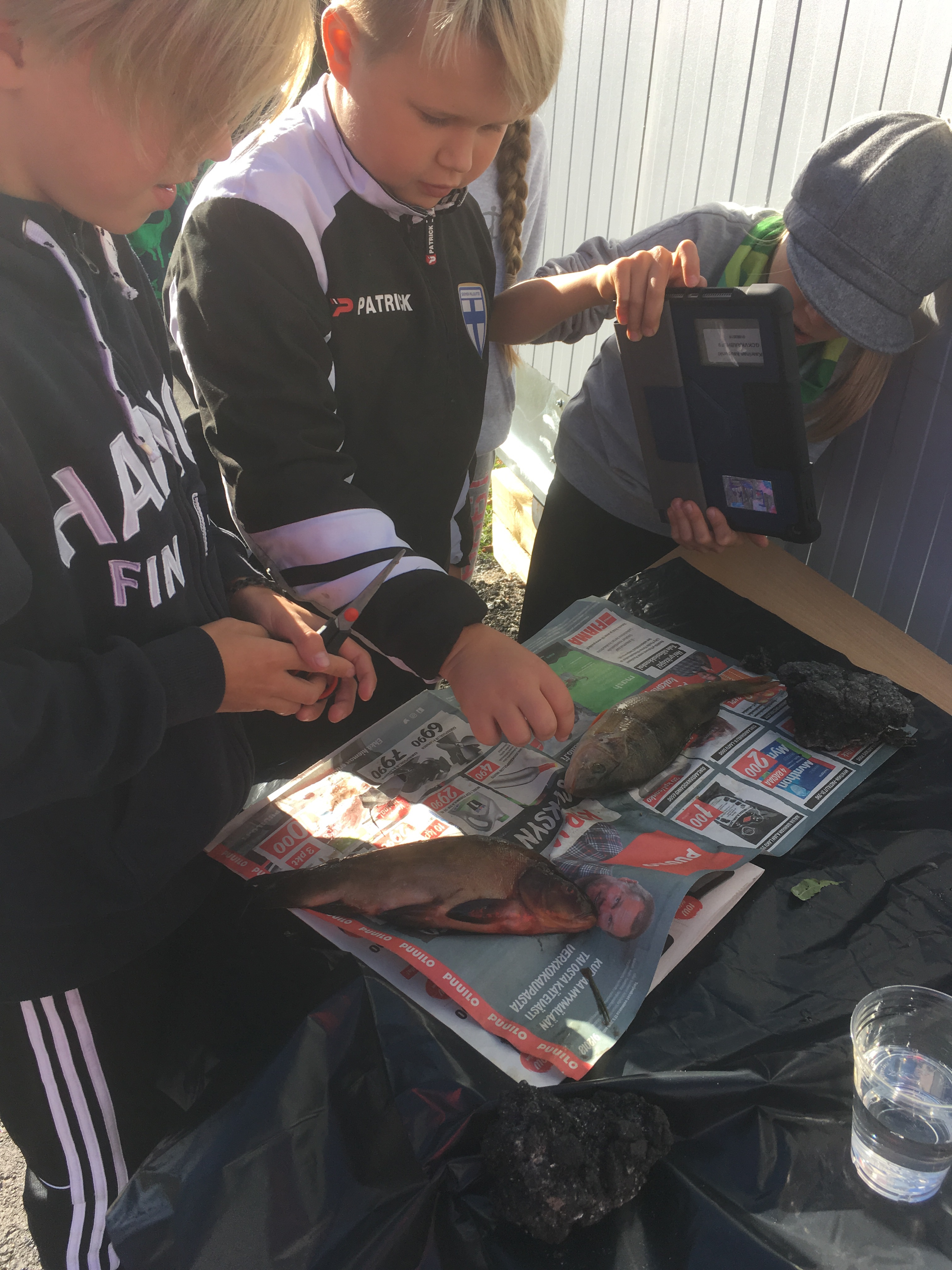 Några elever i åk 4 hade tidigare under veckan varit ut på fisketur och idag var det dags att se hur fiskarna såg ut invändigt.