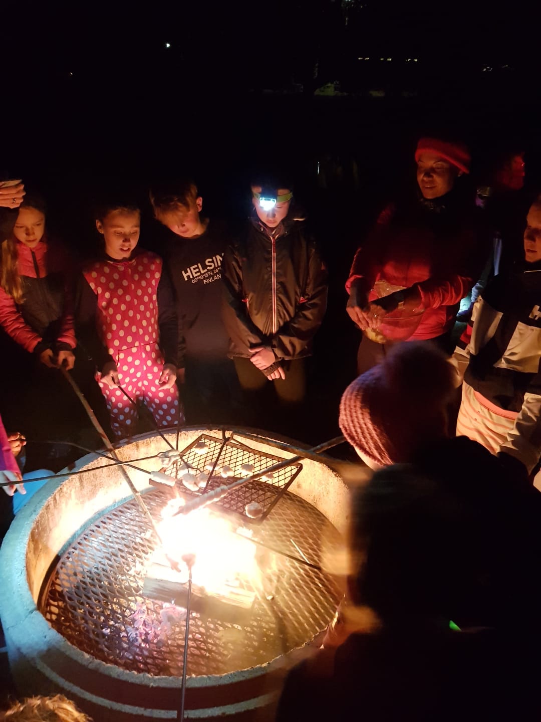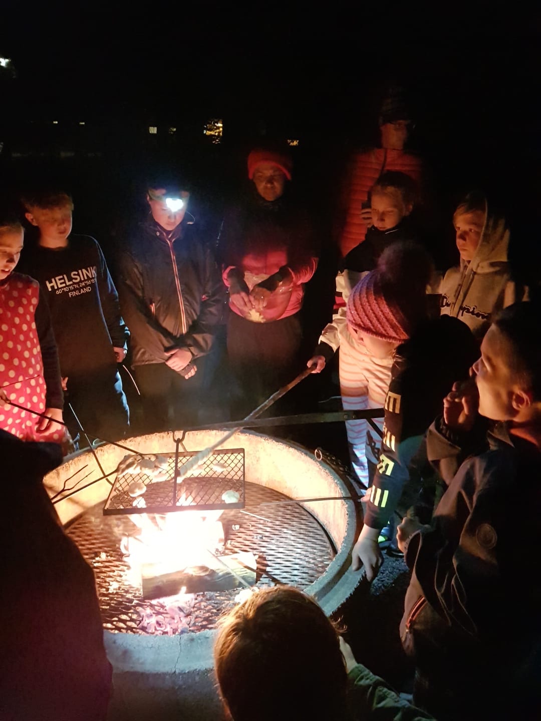 På kvällen, efter middag och bastubad hade vi grillkväll. Vi åt korv och drack saft. Vi hade bra sällskap och vi hade roligt. Vi åt också pinnbröd och det var gott.