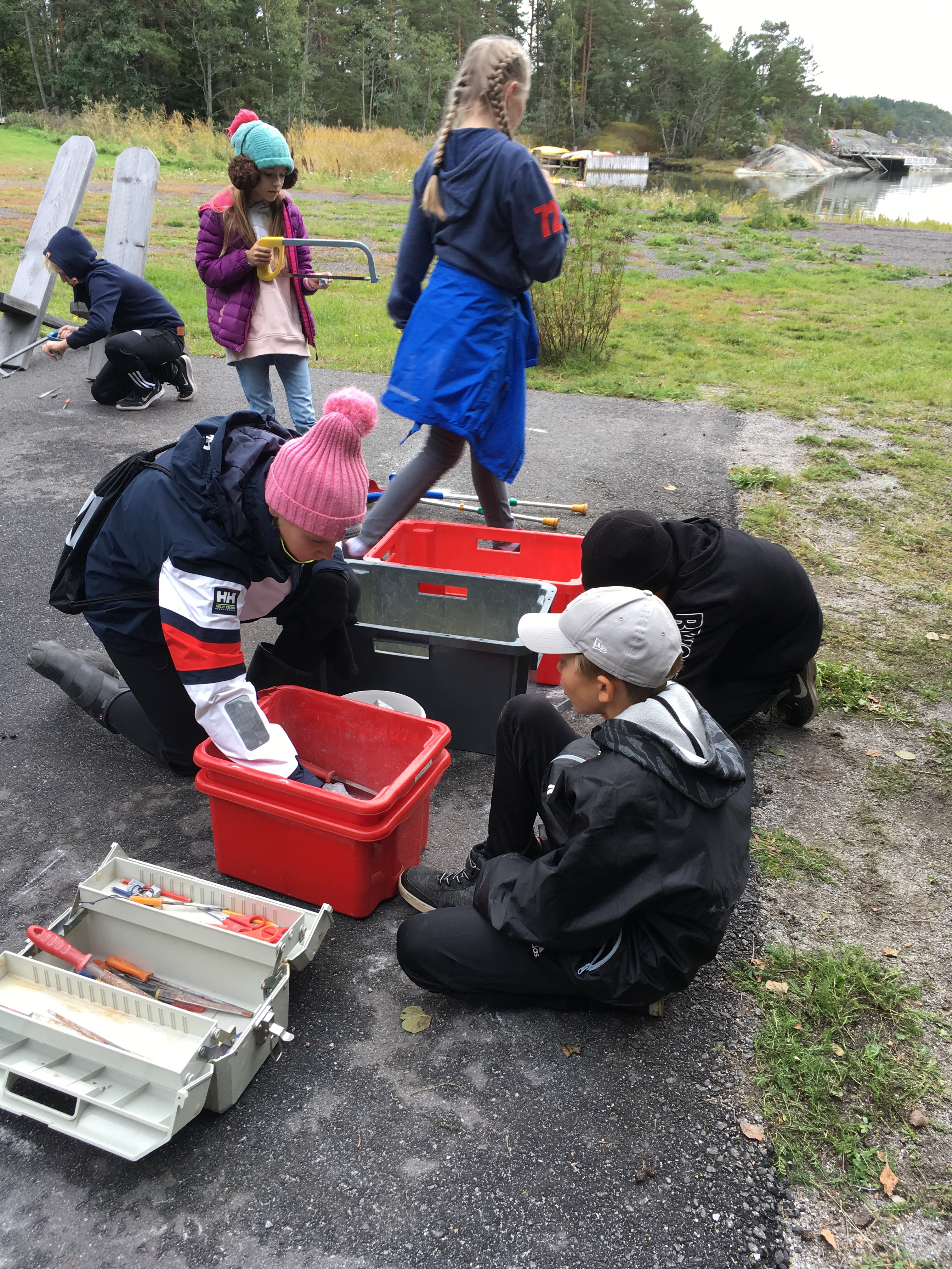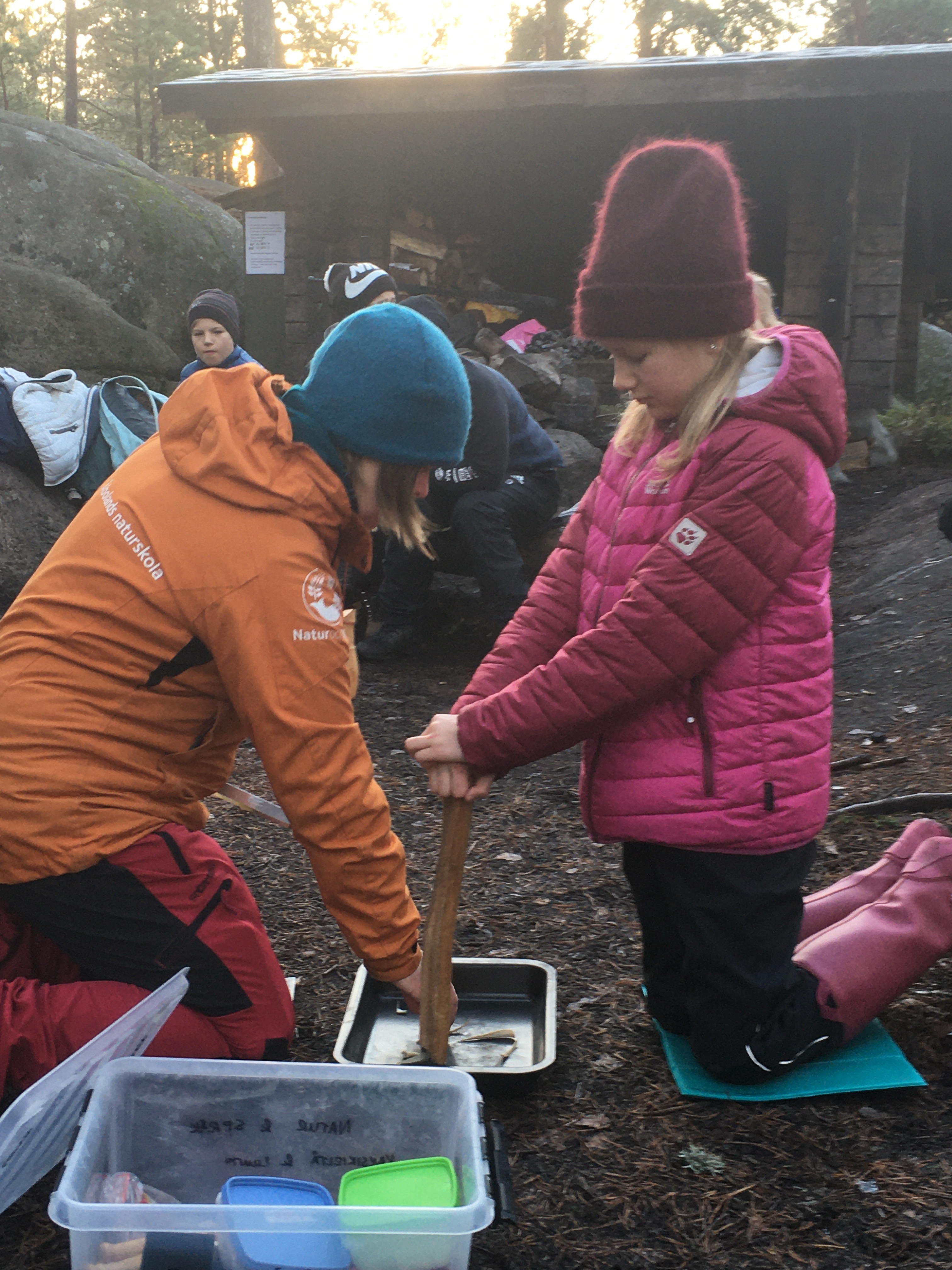 Trots ruskigt väder njöt femmorna av en härlig dag i skogen tillsammans med Åbolands naturskolas lärare Jonas Heikkilä.