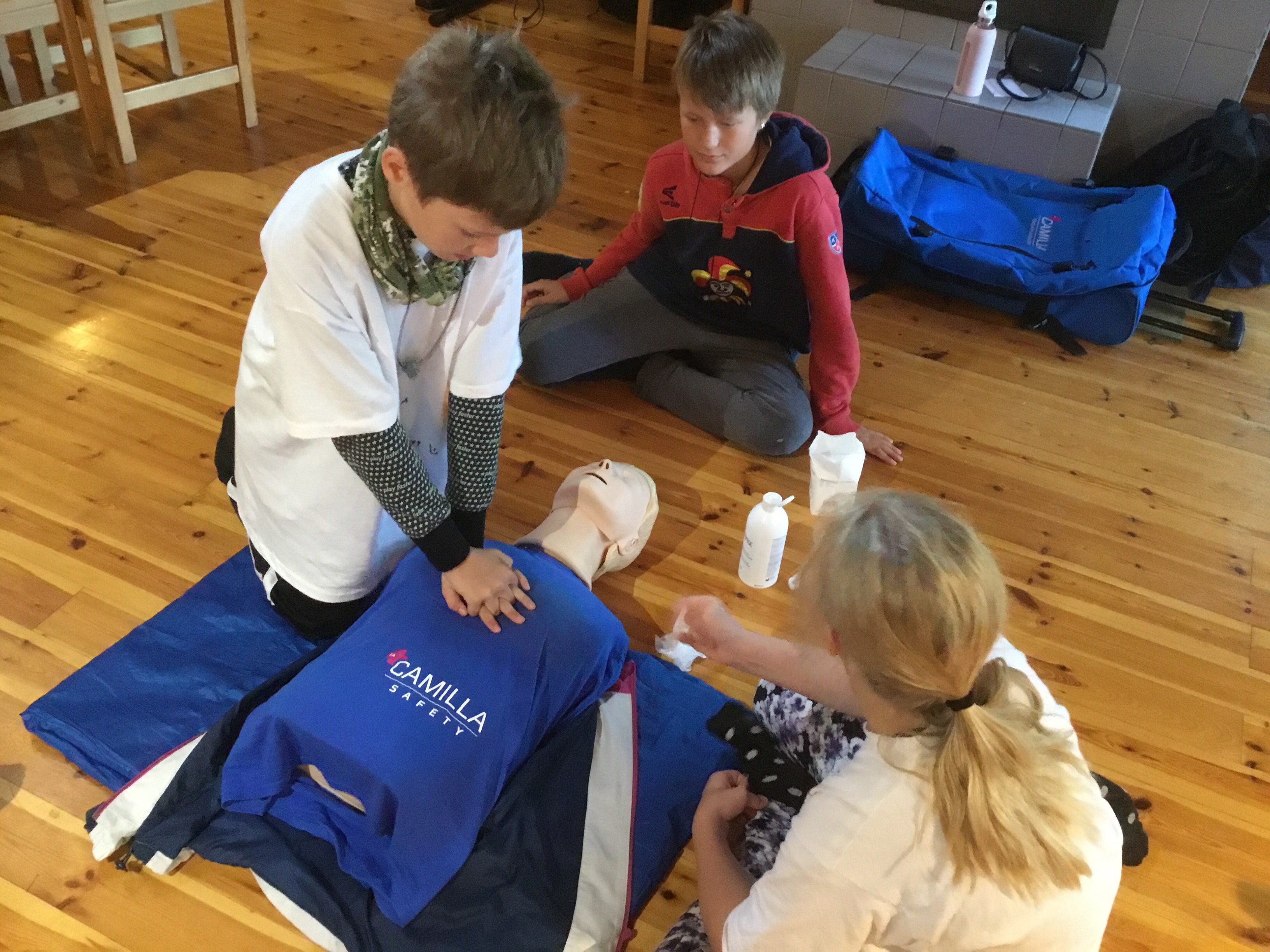 Följande dag hade vi första hjälp med Camilla från Camilla Safety. Vi hade många stationer; så som att använda en träningsdefibrillator på en docka, göra hjärt- och lungräddning på en barndocka och på en vuxendocka. Vi övade på att rulla in en människa i en värmefilt och spelade ett VR-spel. Vi övade också på att använda Heimlich-greppet och lade en människa i sidoläge. Vi övade på att ta rätt material till rätt situation och på att känna igen symptomen till olika sjukdomar.