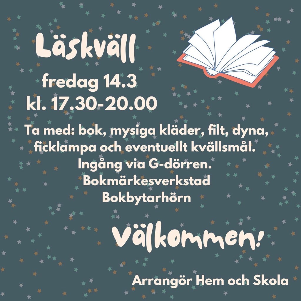 Hem och skola i S:t Karins ordnar en mysig läskväll fredagen den 14.3 för skolans familjer. Info har kommit på Wilma.