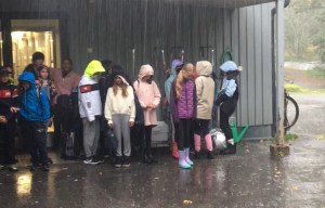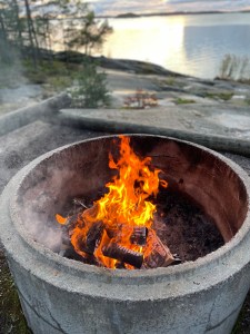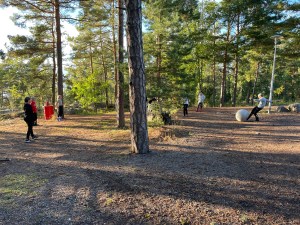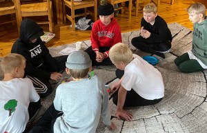 Det regnade första dagen men sedan blev det soligt. När vi kom till vårt rum, så valde vi sängar och skåp. Vi hade helt våta kläder, så vi måste genast byta. På rummet kunde vi dansa och göra vår ”skincare”. Vi lagade nudlar på trangia, tryckte på T-skjortor, täljde barkbåtar och gjorde upp eld. På kvällarna lekte vi sanning & konsekvens, grillade korv och marshmallows. En kväll var vi ute och gick i mörkret med våra ficklampor. Anders berättade en spökhistoria och lurade oss att en elev fattades när vi kom tillbaka till stugan. Alla blev skraja.